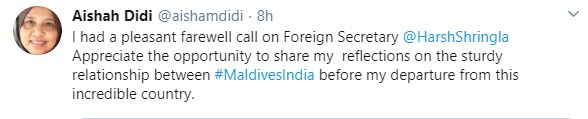 "I had a pleasant farewell call on Foreign Secretary Harsh Vardhan Shringla. Appreciate the opportunity to share my reflections on the sturdy relationship between Maldives India before my departure from this incredible country," she tweeted.