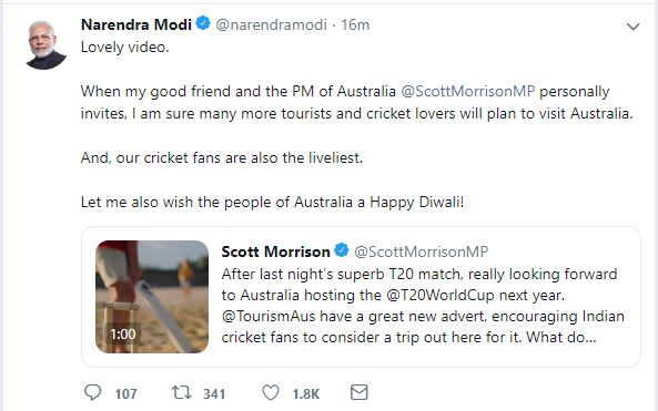 "Lovely video. When my good friend and the PM of Australia @ScottMorrisonMP personally invites, I am sure many more tourists and cricket lovers will plan to visit Australia. And, our cricket fans are also the liveliest. Let me also wish the people of Australia a Happy Diwali," Modi tweeted.