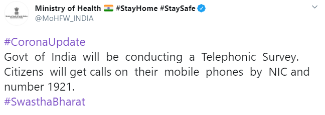 "The Government of India will be conducting a telephonic survey. Citizens will get calls on their mobile phones by NIC and number 1921," read a tweet by the Ministry of Health and Family Welfare.