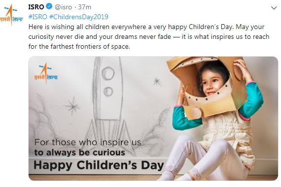"Here is wishing all children everywhere a very happy childrens-day">Children's Day. May your curiosity never die and your dreams never fade -- it is what inspires us to reach for the farthest frontiers of space," ISRO tweeted.