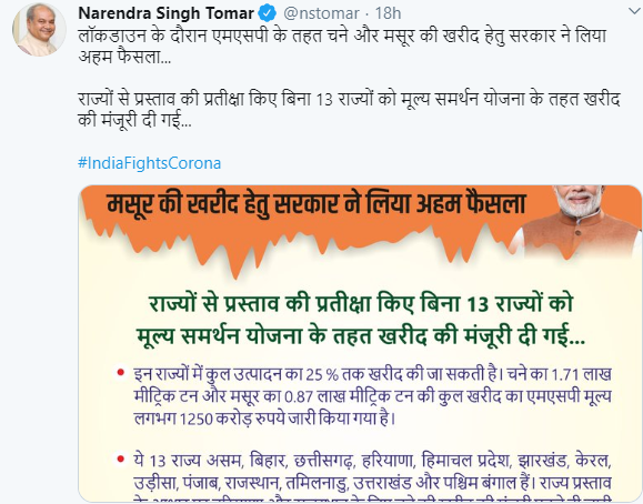 On Sunday, Agriculture Minister Narendra Singh Tomar had tweeted to inform about the government decision about the same.