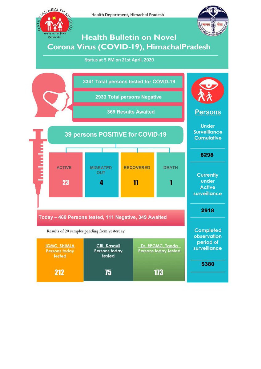 Shimla (Himachal Pradesh) [India], April 21 (ANI): 39 people have tested positive for the Coronavirus in the state as of Tuesday said the Himachal Department of Health.