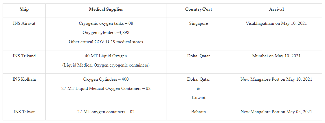 As part of operation 'Samudra Setu II', Indian Naval Ships INS Airavat, INS Trikandand INS Kolkata arrived back home with critical COVID-19 medical stores from friendly foreign countries on May 10, 2021. INS Talwar had arrived on May 5, 2021.