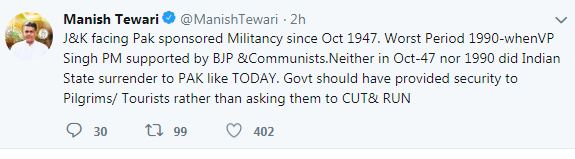 "J-K facing Pak sponsored Militancy since Oct 1947. Worst Period 1990-when VP Singh PM supported by BJP &Communists. Neither in Oct-47 nor 1990 did Indian State surrender to PAK like TODAY. Govt should have provided security to Pilgrims/ Tourists rather than asking them to CUT& RUN," Tewari tweeted.