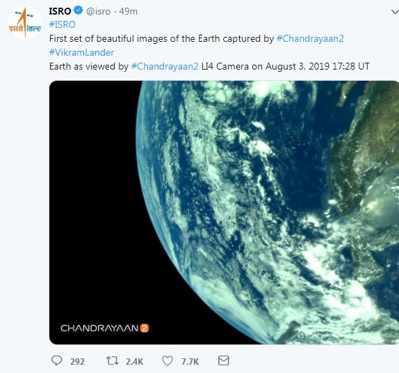 ISRO shares first pictures of Earth captured by Chandrayaan-2