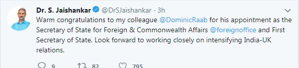 "Warm congratulations to my colleague @DominicRaab for his appointment as the Secretary of State for Foreign & Commonwealth Affairs @foreignoffice and First Secretary of State. Look forward to working closely on intensifying India-UK relations," tweeted S Jaishankar.