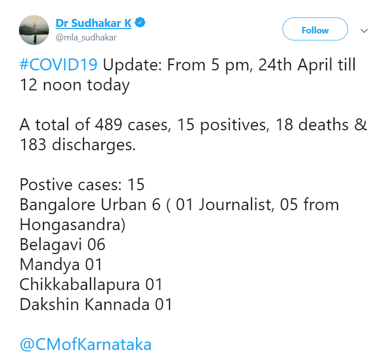 "#COVID19 Update: From 5 pm, 24th April till 12 noon today. A total of 489 cases, 15 positives, 18 deaths & 183 discharges," Sudhakar tweeted.