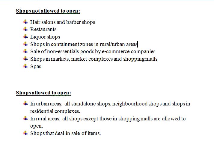 According to the Home Ministry, "In urban areas, all standalone shops, neighbourhood shops and shops in residential complexes are allowed to open. Shops in markets, market complexes and shopping malls are not allowed to open."