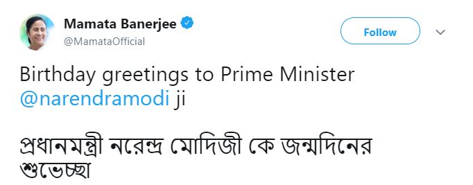 Mamata also wished Prime Minister in two languages, English and Bengali. "Birthday greetings to Prime Minister Narendra Modi Ji," she tweeted.