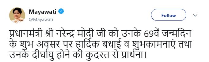 "Heartiest congratulations and best wishes to Prime Minister Narendra Modi on the auspicious occasion of his 69th birthday. I wish him a healthy life ahead," Mayawati tweeted.