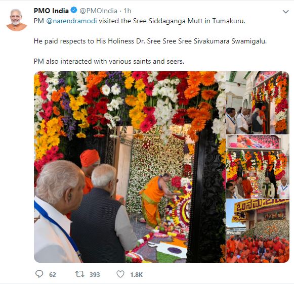 "PM @narendramodi visited the Sree Siddaganga Mutt in Tumakuru. He paid respects to His Holiness Dr. Sree Sree Sree Sivakumara Swamigalu," PMO India tweeted, adding that the Prime Minister interacted with various saints and seers at the monastery.