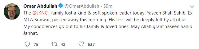 "The @JKNC_ family lost a kind and soft spoken leader today. Yaseen Shah Sahib, Ex MLA Sonwar, passed away this morning. His loss will be deeply felt by all of us. My condolences go out to his family and loved ones. May Allah grant Yaseen Sahib Jannat," Abdullah said in a tweet. (ANI)