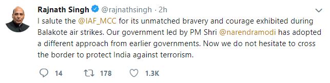 "I salute the Indian Air Force for its unmatched bravery and courage exhibited during Balakote air strikes. Our government led by Prime Minister Narendra Modi has adopted a different approach from earlier governments. Now we do not hesitate to cross the border to protect India against terrorism," he tweeted.