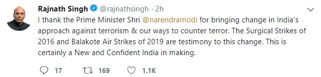 "India today celebrates the first anniversary of Balakote airstrikes. It was a successful counter terror operation launched by the fearless Indian Air Force air warriors. With the success of Balakote air strikes India has clearly demonstrated its strong will against terrorism," Rajnath tweeted.