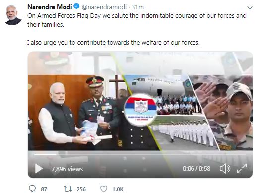 "On Armed Forces Flag Day we salute the indomitable courage of our forces and their families. I also urge you to contribute towards the welfare of our forces," Modi tweeted.