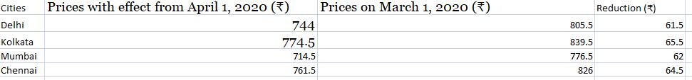 A 14.2-kg non-subsidised LPG cylinder will now cost Rs 744 in Delhi, it will cost Rs 714.50 in Mumbai (down by Rs 62), Rs 774.50 in Kolkata (down by Rs 65.5), and Rs 761.50 rupees in Chennai (down by Rs 64.5).