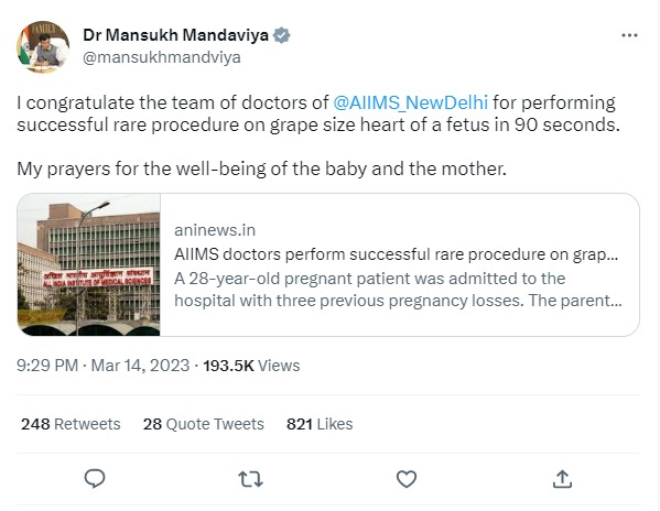 "I congratulate the team of doctors of @AIIMS_NewDelhi for performing successful rare procedure on grape size heart of a fetus in 90 seconds. My prayers for the well-being of the baby and the mother," the Health Minister tweeted sharing the ANI story.