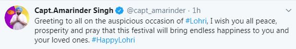 "Greeting to all on the auspicious occasion of Lohri, I wish you all peace, prosperity and pray that this festival will bring endless happiness to you and your loved ones," a tweet from Punjab Chief Minister read.