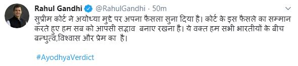 "The Supreme Court has given its verdict on the Ayodhya issue. We have to maintain mutual harmony while honouring the verdict of the court. It is time for brotherhood, trust and love among Indians," Gandhi said in a tweet in Hindi.