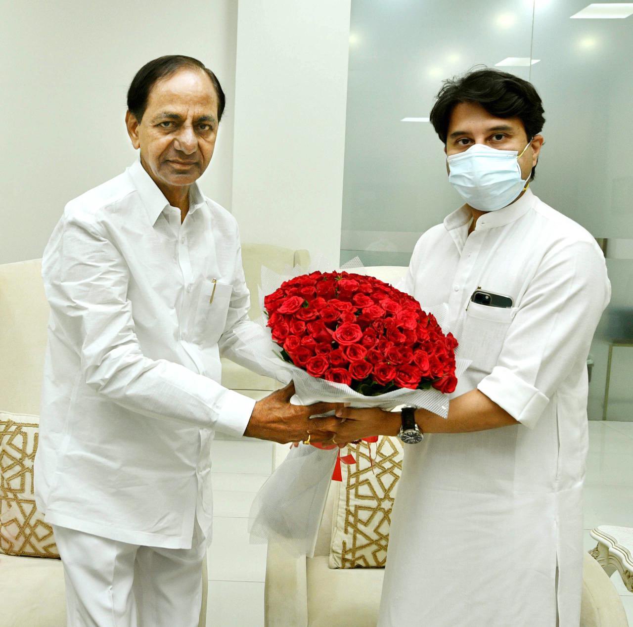 Scindia made a courtesy call on Telangana Chief Minister K Chandrashekhar Rao at Pragati Bhavan today. During the meeting, the two leaders had a detailed discussion on the civil aviation sector.