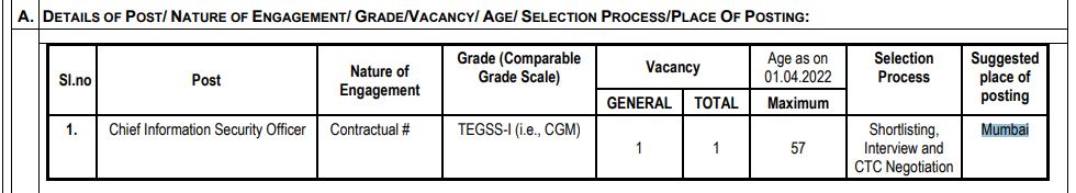There is only one vacancy for the post of Chief Information Security Officer and it will be contractual. The applicants should have the basic qualification of Engineering or Science Graduate/ Post-Graduate in a related field such as Computer Science, IT, Electronics and Communications or a Cyber Security related field or MCA or equivalent qualification from recognized University. The suggested place of posting is Mumbai.