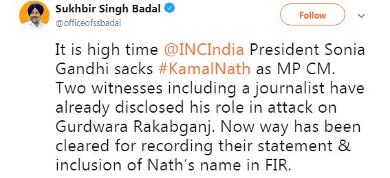 "It is high time Congress President Sonia Gandhi sacks Kamal Nath as MP CM. Two witnesses including a journalist have already disclosed his role in the attack on Gurdwara Rakabganj. Now way has been cleared for recording their statement and inclusion of Nath's name in FIR," SAD President Sukhbir Singh Badal tweeted.
