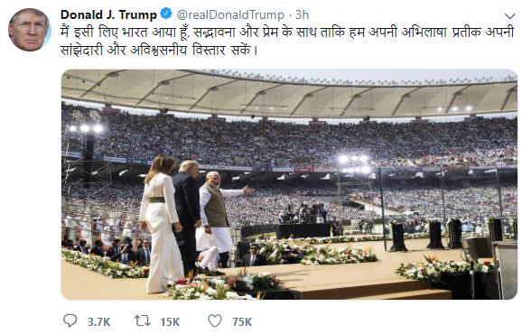 The following tweet attached another picture from the 'Namaste Trump' event, showing him standing alongside Prime Minister Narendra Modi before a huge crowd of around 1,00,000 people inside the Motera Stadium in Ahmedabad.
