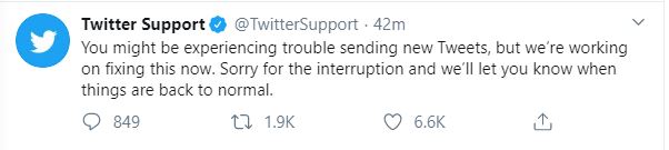 "You might be experiencing trouble sending new Tweets, but we're working on fixing this now. Sorry for the interruption and we'll let you know when things are back to normal," read a statement from Twitter.