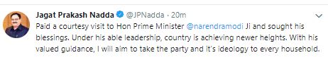 "Paid a courtesy visit to Hon Prime Minister Narendra Modi Ji and sought his blessings. Under his able leadership, the country is achieving newer heights. With his valued guidance, I will aim to take the party and it's ideology to every household," wrote BJP National President on Twitter.