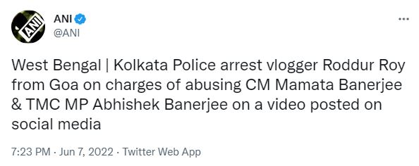 Kolkata (West Bengal) [India], June 7 (ANI): Kolkata Police arrested vlogger Roddur Roy from Goa on Tuesday on charges of abusing West Bengal CM Mamata Banerjee and her nephew and TMC MP Abhishek Banerjee during a Facebook Live session, said police officials.