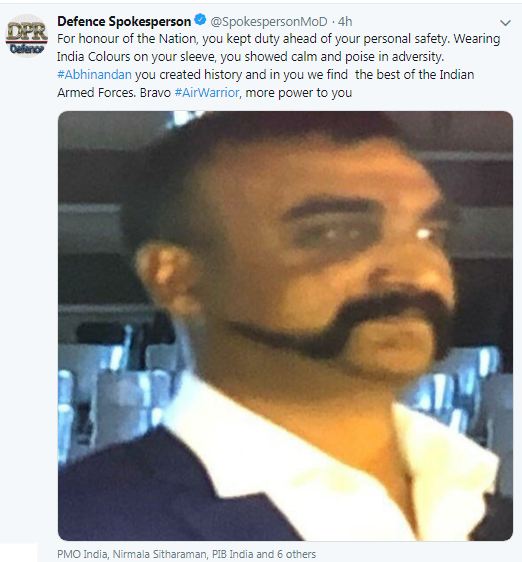 The official Twitter handle of the Defence Ministry’s spokesperson posted, “For honour of the Nation, you kept duty ahead of your personal safety. Wearing India Colours on your sleeve, you showed calm and poise in adversity. #Abhinandan you created history and in you we find the best of the Indian Armed Forces. Bravo #AirWarrior, more power to you.”