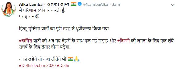 "I accept the result, but don't give up. Hindu-Muslim votes were completely polarised. The #Congress Party will now have to prepare for a new fight with new faces and a long struggle for the people of #Delhi. If you fight today, you will also win tomorrow," Lamba tweeted in Hindi.
