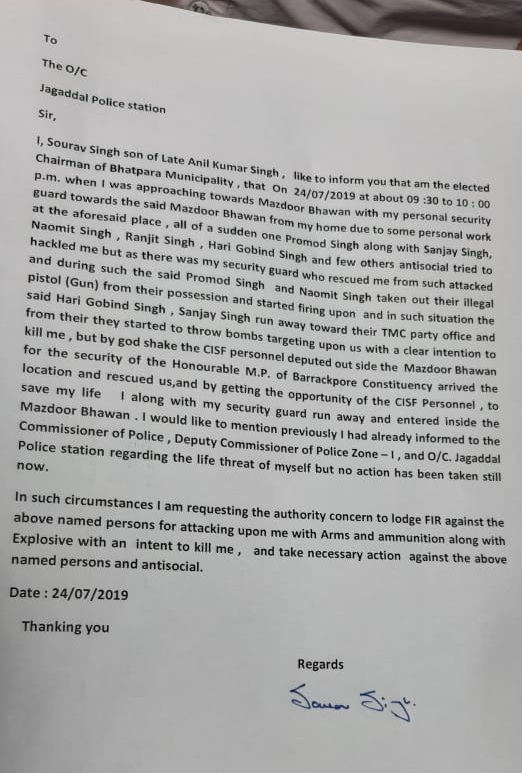 Singh's nephew and Chairman of Bhatpara Municipality, Sourav Singh, has filed a complaint with the police and stated names of a few people who he suspects were involved in the attack.