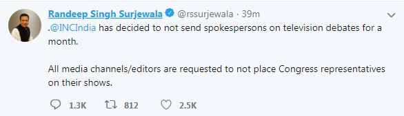 Taking to Twitter, Congress communications in-charge Randeep Singh Surjewala requested all media channels and its editors to not place any Congress representatives on their shows.