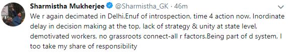 "We are again decimated in Delhi. Enough of introspection, time for action now. Inordinate delay in decision making at the top, lack of strategy and unity at the state level, demotivated workers, no grassroots connect - all are factors. Being part of the system, I too take my share of responsibility," she tweeted.