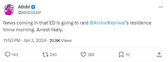 Taking to the social media platform X, AAP leader and Delhi's Law and PWD Minister, Atishi, said, "News coming in that ED is going to raid@ArvindKejriwal's residence tomorrow morning. Arrest likely."