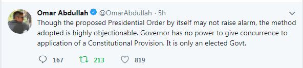 "Though the proposed Presidential Order by itself may not raise alarm, the method adopted is highly objectionable. Governor has no power to give concurrence to application of a Constitutional Provision. It is only an elected Govt," he said on Twitter.