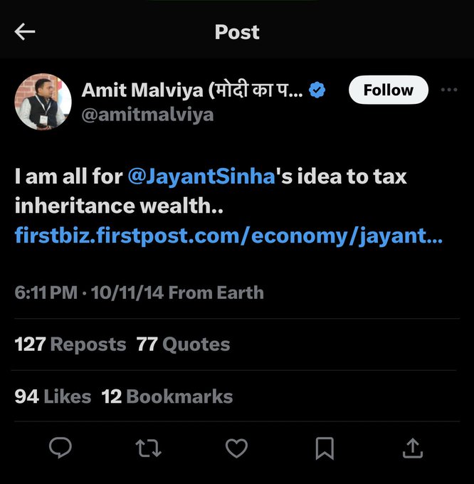 In the screenshot shared with the post, Malviya was seen supporting BJP MP Jayant Sinha's idea to impose a tax on inheritance wealth back in 2014