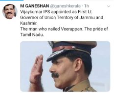 "Vijaykumar IPS appointed as First Lt Governor of Union Territory of Jammu and Kashmir. The Man who nailed Veerappan. The pride of Tamil Nadu," he tweeted.