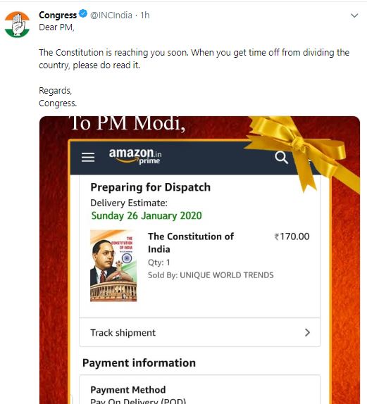 "Dear PM, The Constitution is reaching you soon. When you get time off from dividing the country, please do read it. Regards, Congress," the tweet by the official handle of the Congress said on Sunday.