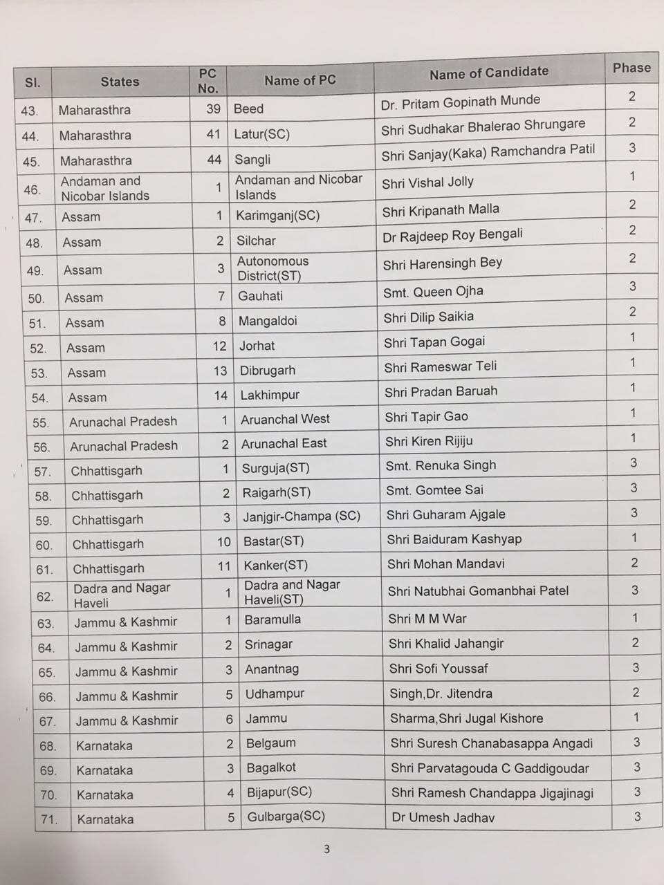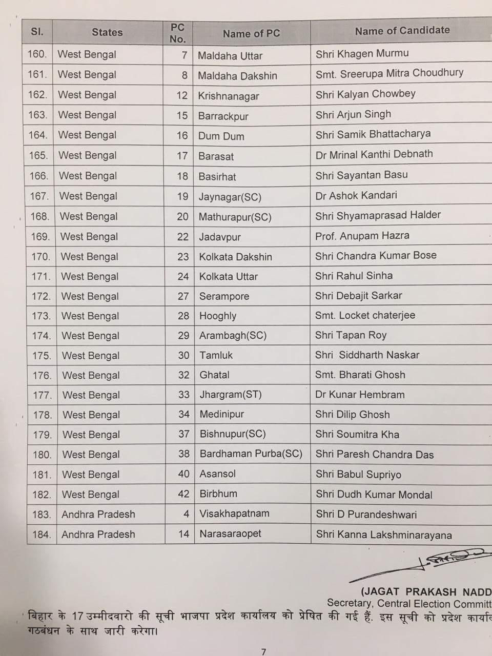 Nadda said that Khalid Jehangir will contest from Srinagar, Jugal Kishore from Jammu, Union Minister Dr Jitendra Singh from Udhampur, and Sofi Yousuf from Anantnag, all seats in Jammu and Kashmir. Union Minister VK Singh will contest from Ghaziabad, and Sakshi Maharaj from Unnao in Uttar Pradesh.”