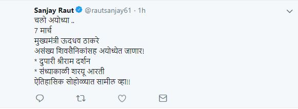 The Maharashtra Chief Minister will also offer prayers on Sarayu riverbanks the same day, informed Raut on the micro-blogging site.