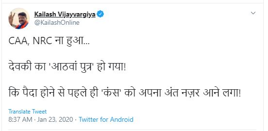 Vijayvargiya, in a tweet, compared the new law to the eighth son of Devki and the Opposition to her brother Kansa.