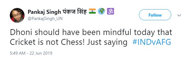 "Dhoni should have been mindful today that Cricket is not Chess! Just saying #INDvAFG," the tweet read.