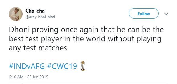 Dhoni has retired from the test cricket but after his slow inning, a fan sarcastically tweeted: "Dhoni proving once again that he can be the best test player in the world without playing any test matches. #INDvAFG #CWC19."