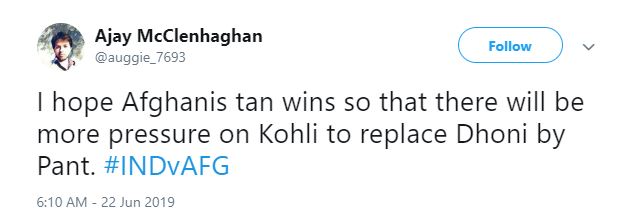 "I hope Afghanis tan wins so that there will be more pressure on Kohli to replace Dhoni by Pant. #INDvAFG," a user tweeted.