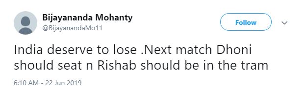 Another tweet read: "India deserve to lose .Next match Dhoni should seat n Rishab should be in the tram."