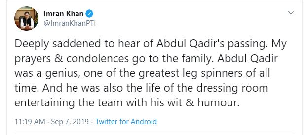 Calling him as "one of the greatest leg spinners of all time", Khan tweeted, "Deeply saddened to hear of Abdul Qadir's passing. My prayers and condolences go to the family. Abdul Qadir was a genius, one of the greatest leg spinners of all time. And he was also the life of the dressing room entertaining the team with his wit and humour".