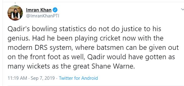 In another tweet, Khan stated that Qadir's bowling stats do not do justice to the talent he possessed.
