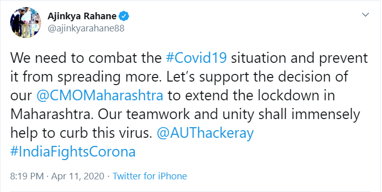 "We need to combat the #Covid19 situation and prevent it from spreading more. Let's support the decision of our @CMOMaharashtra to extend the lockdown in Maharashtra. Our teamwork and unity shall immensely help to curb this virus. @AUThackeray #IndiaFightsCorona," Rahane tweeted.
